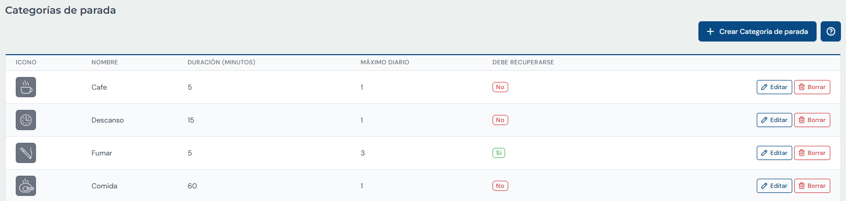 Esta pantalla muestra un listado de los Tipos de Parada definidos por la empresa.