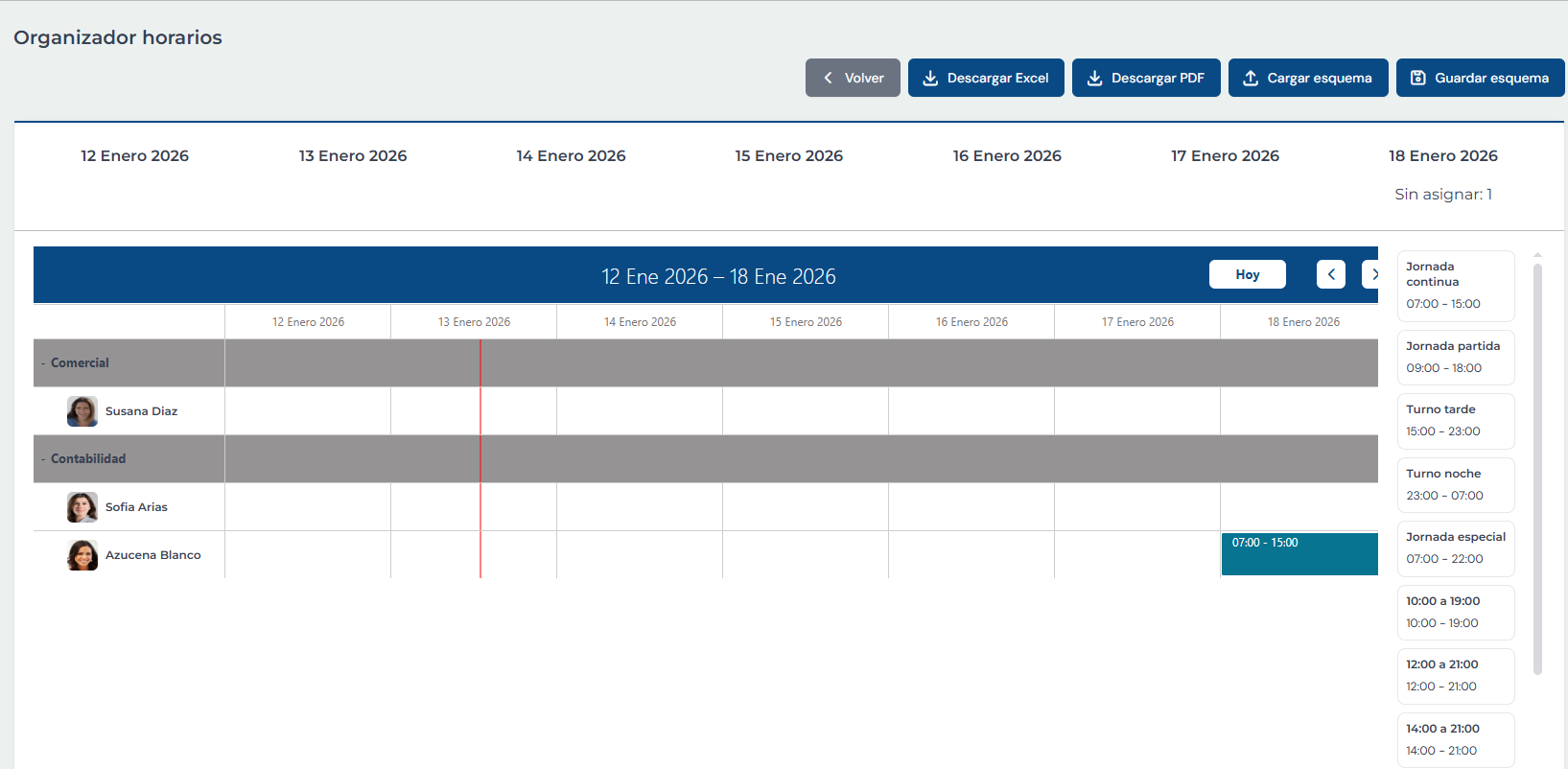 Se descargará una plantilla que servirá para rellenar las distintas jornadas asignadas a cualquiera de los trabajadores. El formato de la plantilla es: