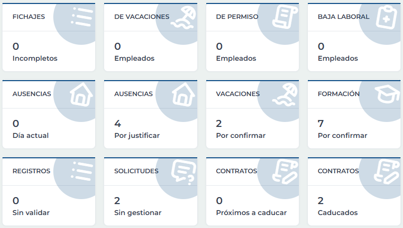 El icono indica el número de “Solicitudes” realizadas por los trabajadores y pendientes de contestar por el administrador. Solo será visible sí está activo el permiso correspondiente en Gestión Empresa -> Datos Empresa -> Permisos -> Ajustes sobre Funcionalidades.